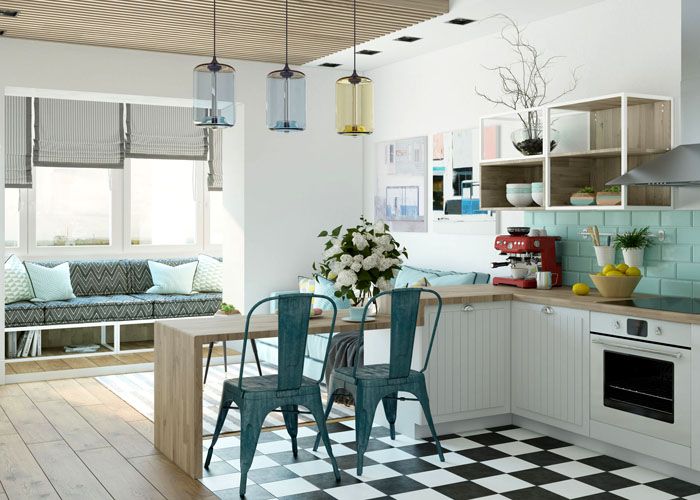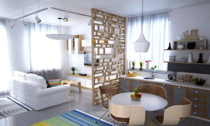 Οταν συνδυάζοντας ένα δωμάτιο με μια κουζίνα μπορείτε να χρησιμοποιήσετε με ασφάλεια ξύλινες επιφάνειες και ανοιχτούς τοίχους. Σε αυτήν την περίπτωση, ακόμη και ένα ψυγείο σε ρετρό στιλ μπορεί να γίνει φωτεινή προφορά. Χωροθέτηση χώρου μπορεί να γίνει με ελαφριά γυάλινα χωρίσματα που αφήνουν φως, ή οθόνες.