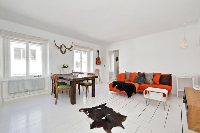 | Χρήση λευκού | Η οροφή και οι τοίχοι στο σκανδιναβικό εσωτερικό είναι κυρίως λευκοί. Επιτρέπεται η χρήση ελαφρών αποχρώσεων παστέλ χρωμάτων για τοίχους. Το λευκό μπορεί να βρεθεί στα έπιπλα. |