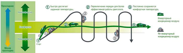 Στον τρόπο λειτουργίας (2), η διατήρηση της θερμοκρασίας με τον τυπικό εξοπλισμό δεν είναι αρκετά αποτελεσματική. Η θερμοκρασία δωματίου είναι πολύ υψηλή ή πολύ χαμηλή.Το σύστημα split inverter εκτελεί ομαλά τις λειτουργίες του (3), χωρίς περιττή κατανάλωση ενέργειας. Ένα επιπλέον πλεονέκτημα είναι η απουσία υπερτάσεων τάσης που μπορεί να βλάψει τα ηλεκτρονικά που είναι συνδεδεμένα στο δίκτυο. Η ακριβής μεταβολή της ταχύτητας μειώνει τη φθορά και παρατείνει τη διάρκεια ζωής του συμπιεστή.
