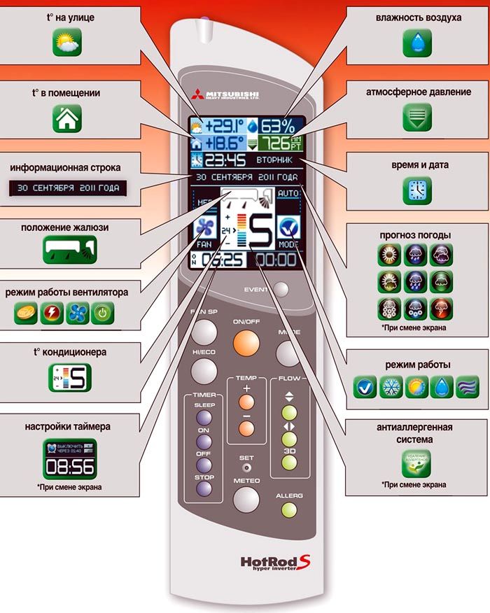 Με τον κατάλληλο εξοπλισμό, ο ιδιοκτήτης αυτού του εξοπλισμού θα λάβει επιχειρησιακές πληροφορίες σχετικά με τη θερμοκρασία του αέρα έξω και σε εσωτερικούς χώρους. Η έγχρωμη οθόνη δείχνει την ώρα και την ημερομηνία, την υγρασία, την ατμοσφαιρική πίεση, την πρόγνωση καιρού, το μενού, τον τρόπο λειτουργίας. Ο χρήστης μπορεί να ελέγξει την κατεύθυνση και την ταχύτητα των ροών αέρα, να ενεργοποιήσει επιπλέον φίλτρα. Χρησιμοποιώντας ένα χρονόμετρο, η ενεργοποίηση / απενεργοποίηση ρυθμίζεται σύμφωνα με ένα συγκεκριμένο χρονοδιάγραμμα. Ειδικός λειτουργία αφύγρανσης εξαλείφει τη συσσώρευση συμπυκνώματος στην εσωτερική μονάδα, εξαλείφει τις ευνοϊκές συνθήκες για τη ζωή των μικροοργανισμών.