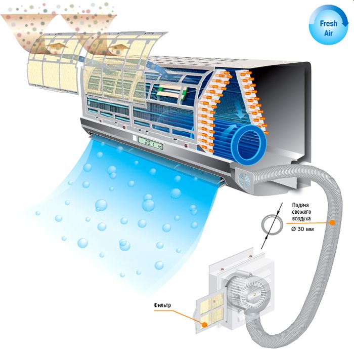 Το σύστημα split χωρίζεται σε δύο λειτουργικά μέρη. Ο συμπιεστής είναι εγκατεστημένος σε εξωτερικούς χώρους. Ένα μπλοκ με εναλλάκτη θερμότητας είναι τοποθετημένο μέσα στο δωμάτιο και ανεμιστήρας... Πολλά μοντέρνα μοντέλα είναι εξοπλισμένα με θερμαντήρες, φίλτρα. Αυτός ο εξοπλισμός επεκτείνει σημαντικά τη βασική λειτουργικότητα.