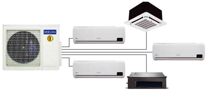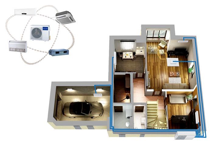- Η χρήση πολλών εσωτερικών μονάδων (όπως στο σχήμα) παρέχει τη δημιουργία ανεξάρτητων συστημάτων θερμοκρασίας σε ξεχωριστούς χώρους. Αυτό αυξάνει τη συνολική αξιοπιστία του συστήματος έμμεσα.