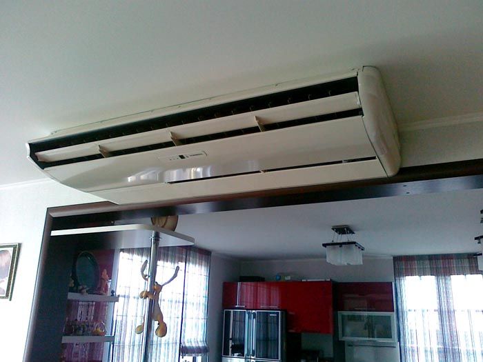 Σε αυτόν τον σχεδιασμό, η εσωτερική μονάδα καταλαμβάνει λίγο χώρο. Κατά κανόνα, εγκαθίσταται πιο κοντά στην οροφή. Η φωτογραφία δεν είναι ιδανική επιλογή, καθώς η ροή ψυχρού αέρα θα πλήξει τους χρήστες. Αυτό προκαλεί κρυολογήματα και άλλες ασθένειες. Για να μην περιπλέξετε τη λειτουργία με πολύπλοκες ρυθμίσεις, εγκαταστήστε αυτά τα στοιχεία πάνω από το κεφάλι του κρεβατιού, πίσω από το πίσω μέρος του καναπέ.
