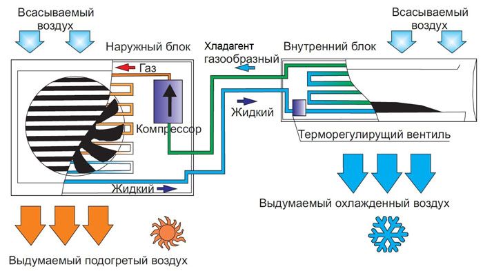 Με τη βοήθεια αυτού του σχήματος, θα καταλάβουμε ακριβώς πώς λειτουργεί ένα τυπικό σύστημα split. Ο συμπιεστής δημιουργεί την πίεση στο σύστημα που απαιτείται για τη μετακίνηση του ψυκτικού. Όταν θερμαίνεται, το ψυκτικό παρέχεται από το δωμάτιο. Στο δρόμο, κρυώνει, μετατρέπεται σε υγρό. Σε αυτήν την κατάσταση, εισέρχεται στον εναλλάκτη θερμότητας της εσωτερικής μονάδας, όπου ψύχει τον αέρα. Εδώ, γίνεται η μετάβαση στο αέριο, το οποίο ρέει μέσω των σωλήνων στον συμπιεστή. Η βαλβίδα ελέγχου που φαίνεται στο σχήμα ελέγχεται λαμβάνοντας υπόψη τον έλεγχο θερμοκρασίας δωματίου.