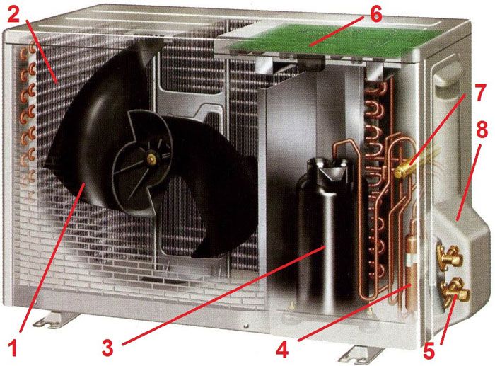 - Στον συμπυκνωτή (2), το μείγμα αερίου ψύχεται. Πολλά πτερύγια καλοριφέρ αυξάνουν την απόδοση της μονάδας, επιταχύνοντας τη μεταφορά υπερβολικής θερμότητας στο περιβάλλον.