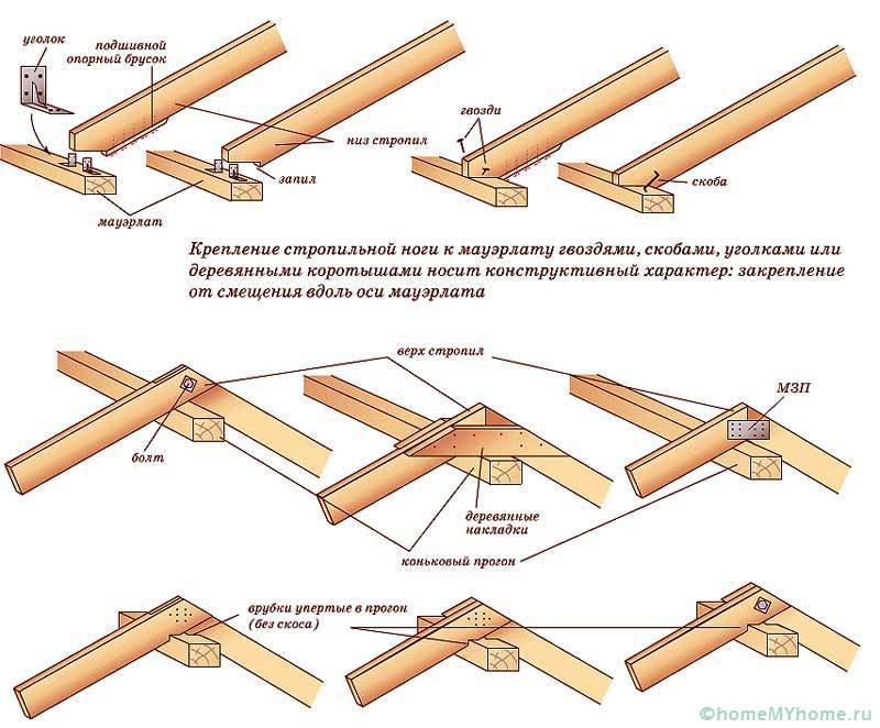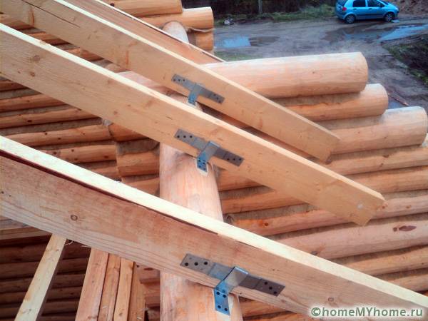 Οι δοκοί μπορούν να στερεωθούν στο Mauerlat κόβοντας τμήματα των ακτίνων επαφής σε βάθος 1/3 της διατομής τους. Σε αυτήν την περίπτωση, είναι σημαντικό να τηρείτε τη γωνία επαφής έτσι ώστε να εμπλέκονται άνετα μεταξύ τους. Η δεύτερη μέθοδος στερέωσης είναι η τοποθέτηση χαλύβδινων πλακών στερέωσης στις πλευρές του στηρίγματος, apo στο κέντρο - η εγκάρσια ράβδος.