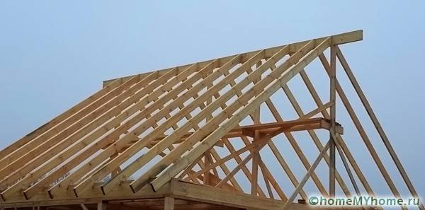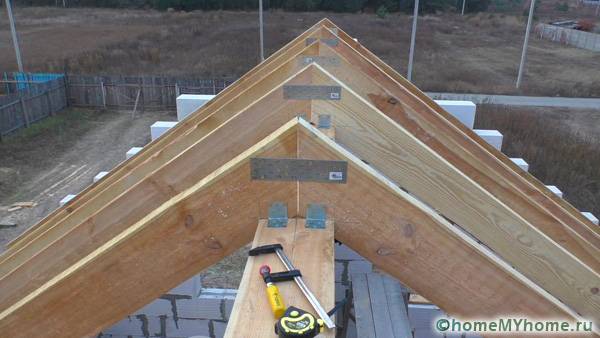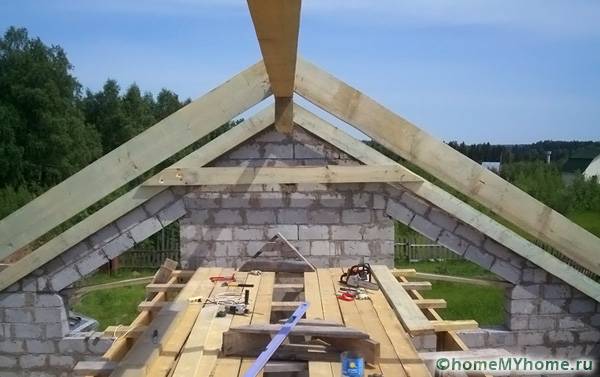 Μια ράβδος κορυφογραμμής είναι εγκατεστημένη στη διασταύρωση δύο κεκλιμένων δοκών. Στη συνέχεια εγκαθίστανται ριπές. Για στρωματοποιημένη οροφή, τοποθετούνται γόνατα Στην πλευρά των πλαγιών, το περίβλημα τοποθετείται με γήπεδο και πάχος των σανίδων που πληρούν τις απαιτήσεις για την εγκατάσταση ενός συγκεκριμένου υλικού στέγης. Μετά από αυτό, οι δοκοί για την οροφή του αετώματος είναι πλήρως εγκατεστημένοι με τα χέρια τους.