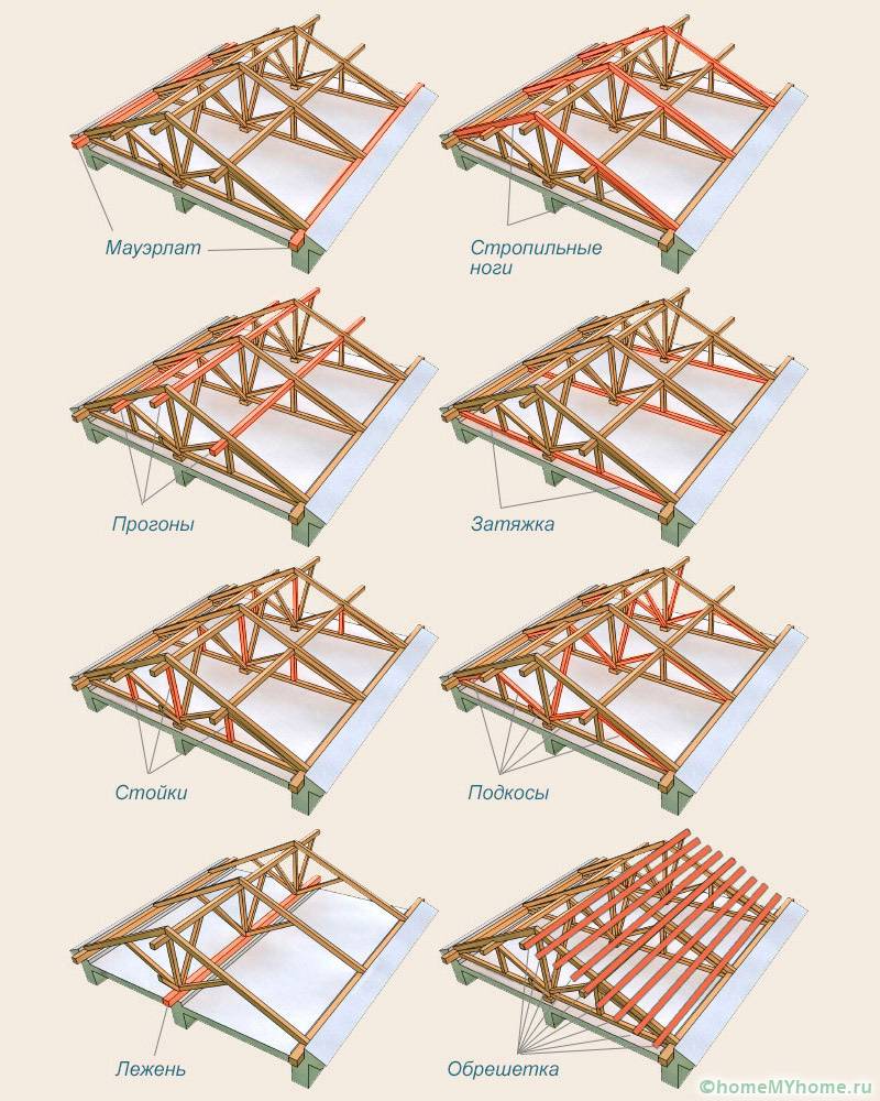 - Mauerlat... Παρέχει τη μεταφορά του φορτίου της δομής στέγης στους φέροντες τοίχους του αντικειμένου, δημιουργώντας την ομοιόμορφη κατανομή του. Η ξυλεία είναι κατασκευασμένη από σκληρό ξύλο όπως αγριόπευκο, βελανιδιά, τέφρα. Το ελάχιστο επιτρεπόμενο τμήμα είναι 100x100 mm. Επιτρέπεται η χρήση όχι μόνο μασίφ ξυλείας, αλλά και κολλημένης ξυλείας, αλλά και με διατομή 100x150 mm.