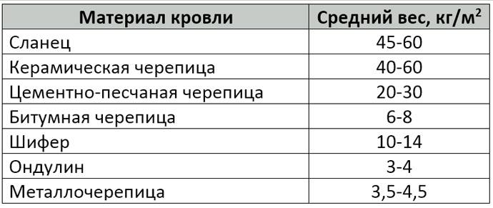 - Μόνιμος... Περιλαμβάνουν το βάρος όλων των χρησιμοποιούμενων υλικών: μόνωση, πλέγματα, μονωτικά φιλμ, υλικό στέγης, επιπρόσθετα στοιχεία, συστήματα συγκράτησης χλωρίδας και χιονιού, φινιρίσματα, σοφίτα στοιχεία κ.λπ. Κατά προσέγγιση φορτία κατά τη χρήση ορισμένων υλικών στέγης παρουσιάζονται στον Πίνακα 1.