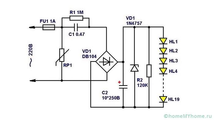 In the presented circuit, the reactance of the capacitor acting as a ballast allows to extinguish the voltage without significant heat release. For safety, this element is shunted with a high-voltage resistor. The diode bridge acts as a filter that powers the LED chain. The zener diode protects the backlight from increasing direct current.