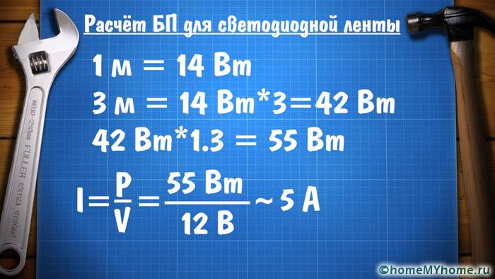 Before calculating the power supply for the LED strip, you need to know the total power of the entire backlight. To determine how many watts one meter of flexible board consumes, you can use a special table.