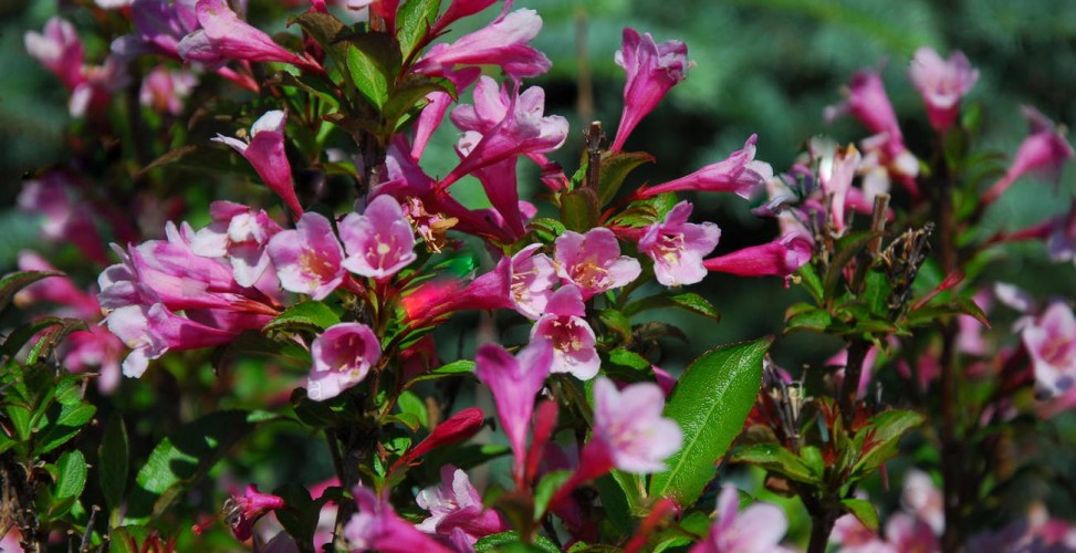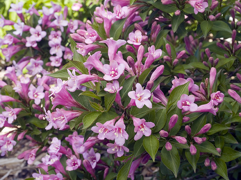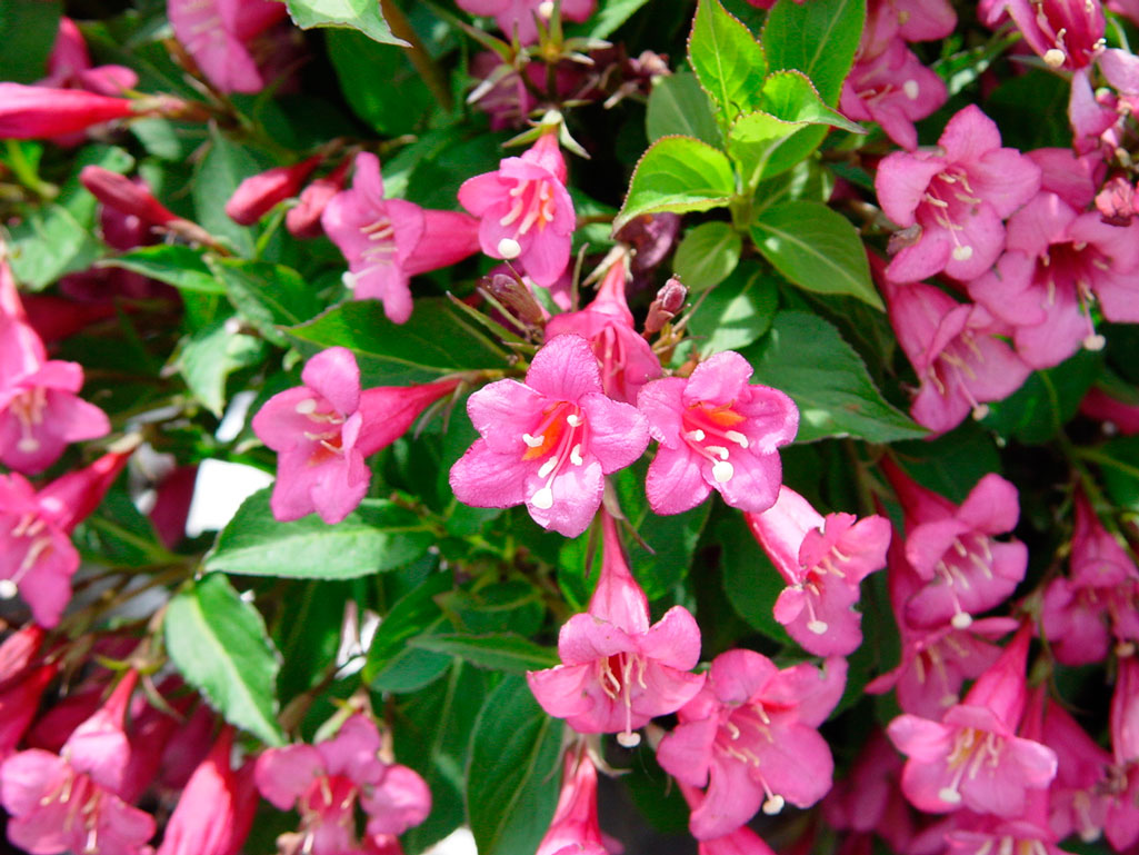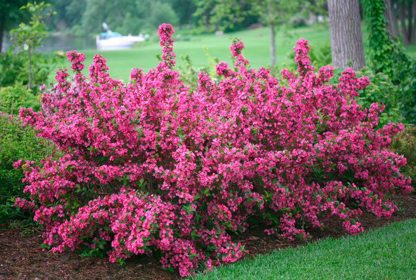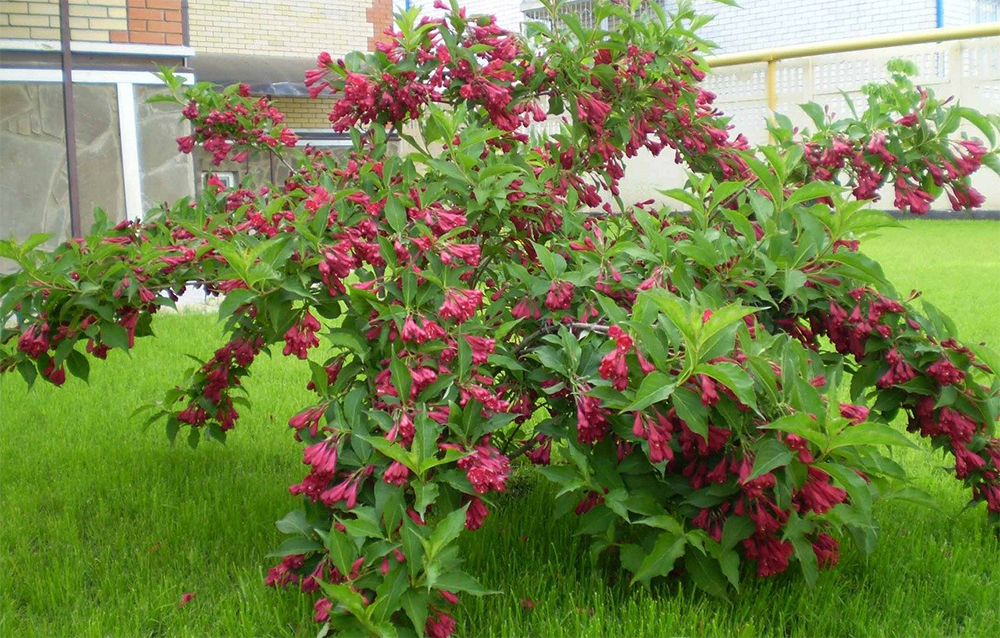 A neat plant reaching 2 meters in height. Shrub flowers have a characteristic bright red hue. Blooms in May and ends only at the end of July. Weigela is unpretentious and can easily take root even in the middle lane.