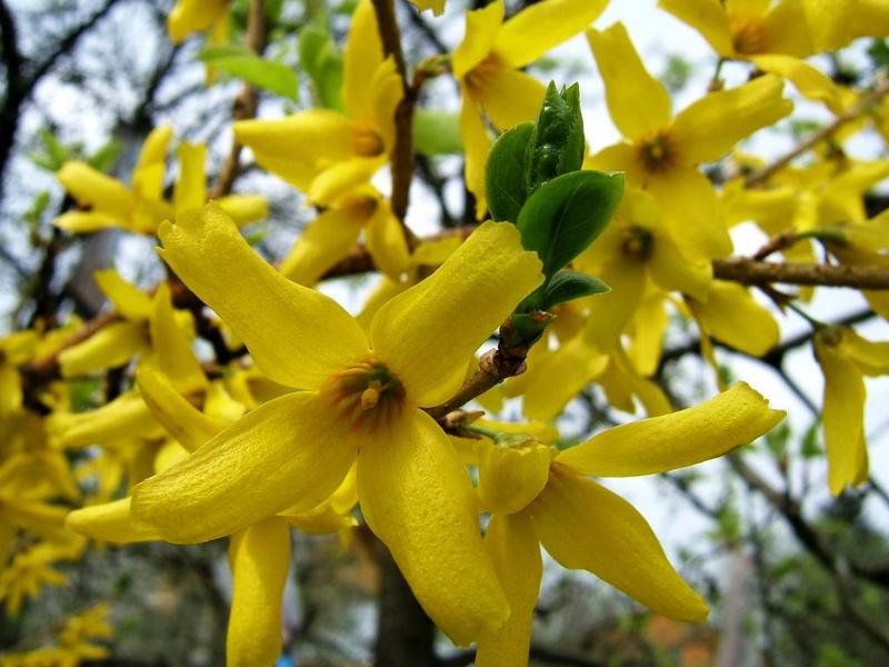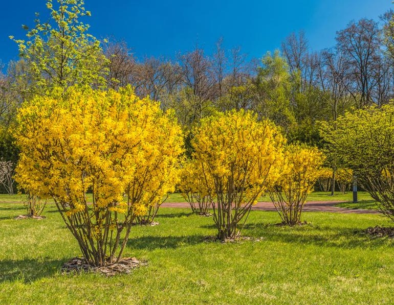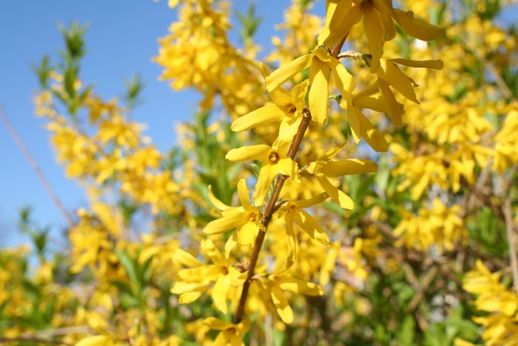 Forsythia is known for its flowers blooming before foliage appears, it is not a very tall, circular plant with yellow flowers. Its peculiarity is that in autumn the inflorescences acquire a scarlet color. Perennial flowering shrubs need constant sun and protection from the winds. But they are not demanding in care and take root almost everywhere.