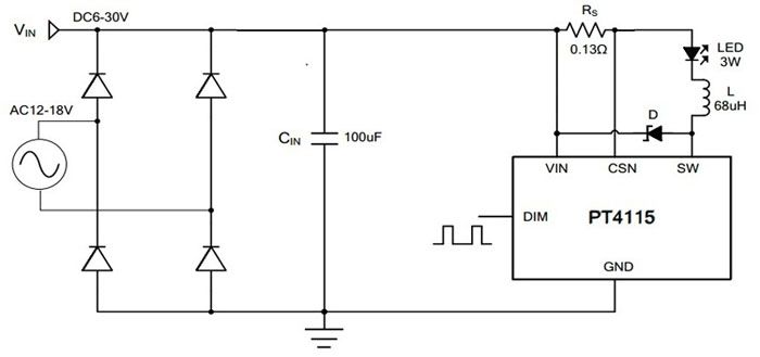 It is recommended to use tantalum capacitors for correct operation of the converter. If you do not install a capacitor for power, then an integrated microcircuit (IC) will simply fail when the device is connected to the network. Above is a diagram of the driver for the LED on the PT4115 IC.