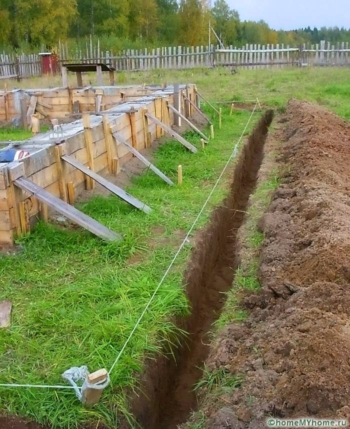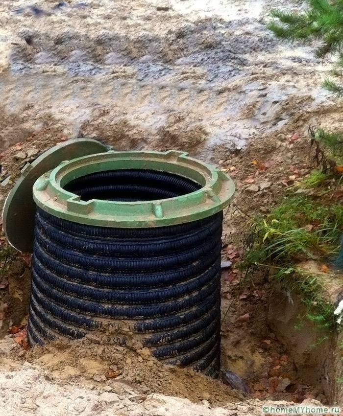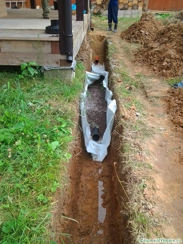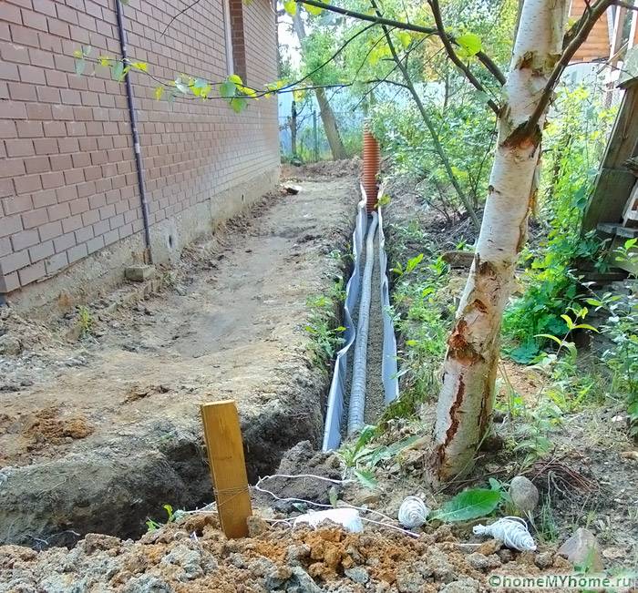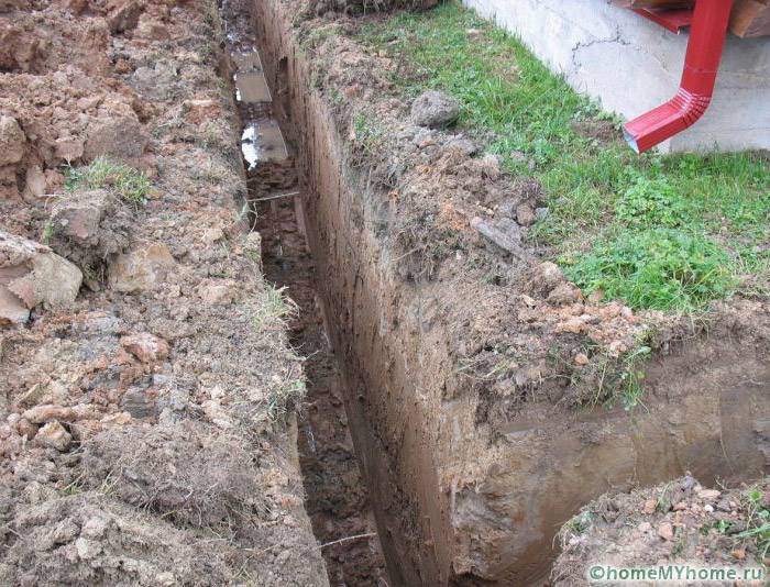 - Trenching is carried out with a slope of 2 cm towards the well. Their bottom is covered with a sandy layer of 10-15 cm. All irregularities made during excavation work are hidden.