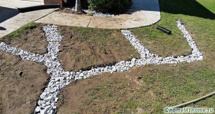 Natural stones or brushwood are most often used as materials for decoration. First, large cobblestones are laid at the bottom of the ditches, allowing the formation of channels for the passage of water. Then stones of medium size or tree branches are laid.