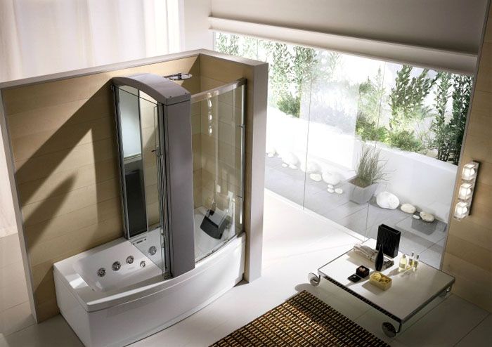 The compact size and closed design make it possible to place shower cabins with a bath not only in bathrooms, but also in other rooms of a country house. If an open structure is used, this is also possible, but then when decorating a room, it is necessary to use materials that have a water-repellent effect and are not subject to destruction by water. Below are several options for the placement of shower cabins equipped with a bathroom, in various design solutions for the interior design of an apartment and a country house.