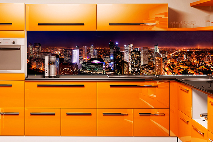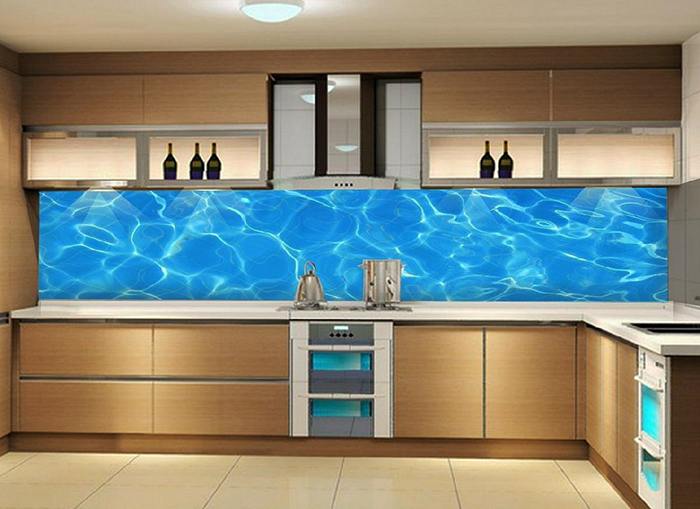 This is one of the decent design options for the work area in the kitchen. Has long become an alternative to traditional glass surfaces. Using a polycarbonate kitchen apron, you can create the most unusual designs, it is even permissible to combine them with each other.