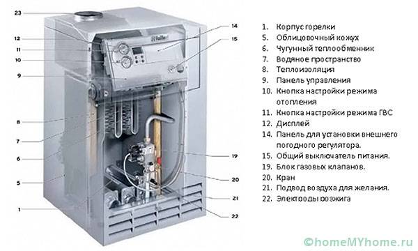 During the combustion of gas, a lot of heat is released, which passes through a heat exchanger of complex shape and heats the water. In wall-mounted appliances, this unit is made of steel or silumin, which is why the service life is short. This choice of materials is due to restrictions on the mass of wall-mounted boilers. There is no such limitation in floor-standing devices, therefore the heat exchanger is made of cast iron, which ensures a long (tens of years) service life and high efficiency.