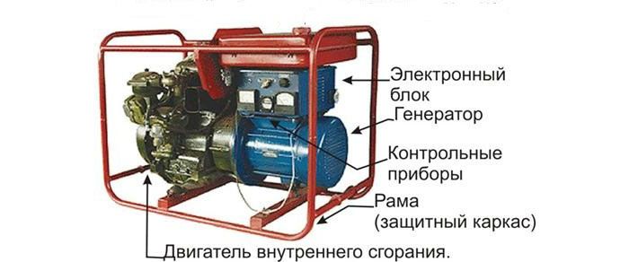 In addition, the unit includes such elements as: protection and operation control units, fuel injection and exhaust gas removal, as well as a body (frame) on which all structural elements are located.