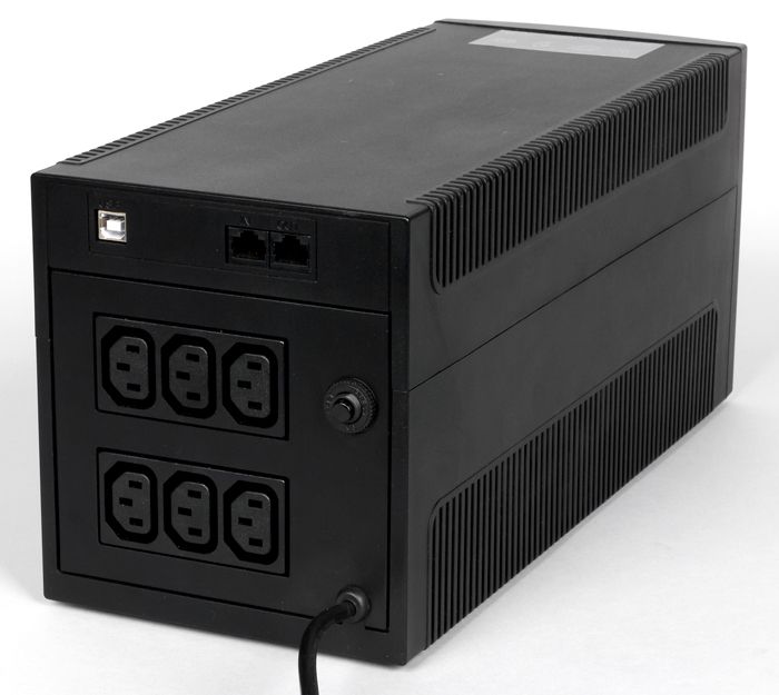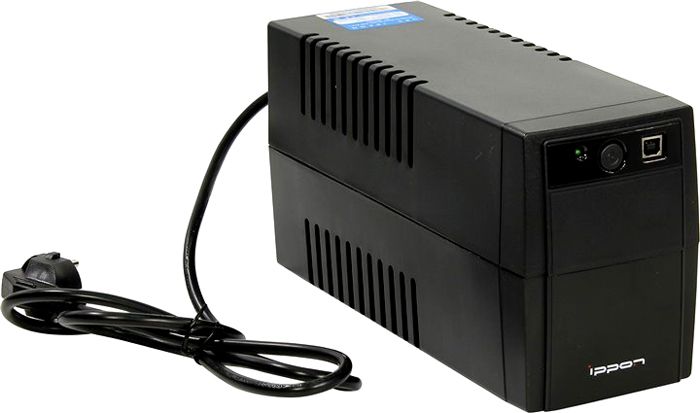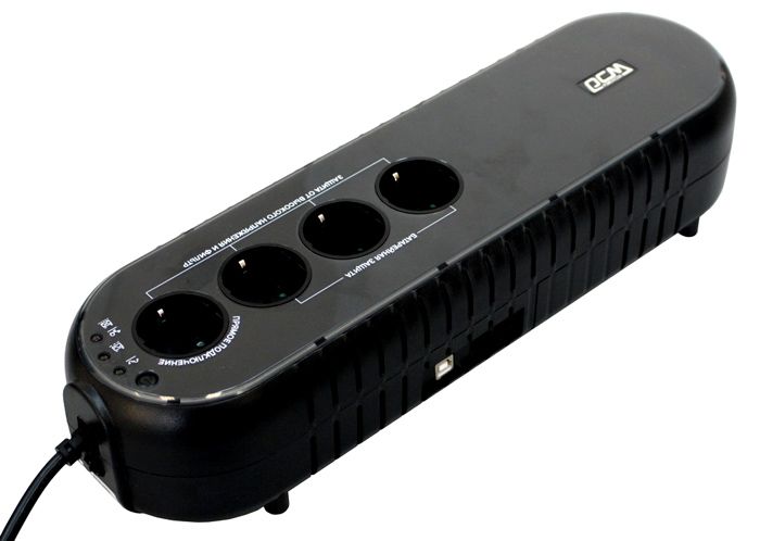 Inexpensive and compact uninterruptible power supply. Device for organizing backup power supply. The battery will last for 10 minutes. The device is equipped with 4 sockets. An uninterruptible power supply protects your network equipment and helps you save documents. There is a connector for a USB cable on the case. An automatic shutdown is provided if the battery charge drops to a certain value.