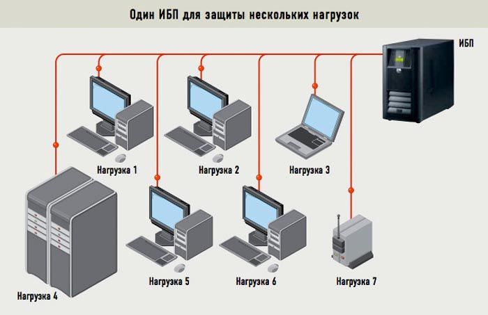 The scheme of operation of uninterruptible equipment is simple: in a normal situation, the load is fed from the mains, and if the voltage disappears, it switches to battery mode.