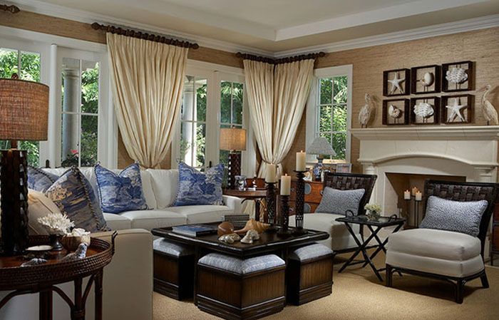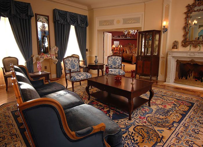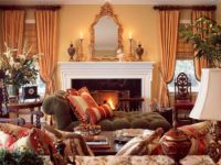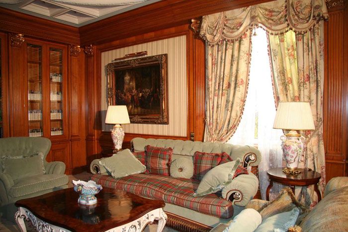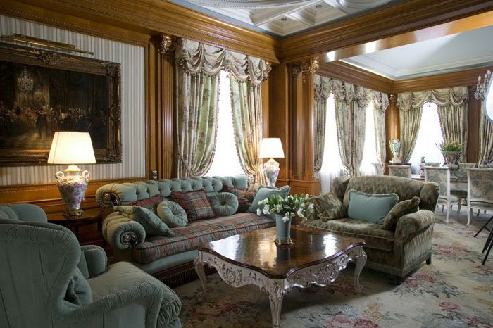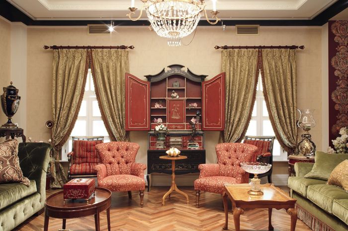 For the textile decoration of the room, heavy expensive fabrics are used. Curtains are hung on the windows, which are picked up with strings with tassels or braid. Upholstered furniture is decorated pillows various shapes of velvet or silk. Curbstones and tables are usually covered with lace napkins and tablecloths.