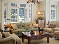 For a room in the style of England, diffuse lighting should be organized. It is achieved through the use of numerous sconces, floor lamps and lamps. Different types of lighting also play the role of additional space zoning. Around the dining area, a row of lamps is installed that illuminate the table from all sides; it would be appropriate to install a floor lamp near the reading chair. In the central part of the living room, you can hang a large chandelier with candle-shaped bulbs, but this will only be relevant if there are high ceilings.