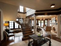 The English style in the interior of a modern apartment is devoid of fuss and dynamics. Here you plunge headlong into the atmosphere of measuredness and tranquility. The inherent attributes of style are stairs, library and fireplace... The stairs are made of wood and decorated with carvings.