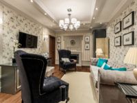 The living room seems to be created to embody the atmosphere of the Old World. A library, a fireplace, a Chester sofa set opposite, reading chairs and elegant floor lamps will perfectly fit into it. The luxury of the furnishings combined with the restrained decor will undoubtedly emphasize the good taste of the owners.