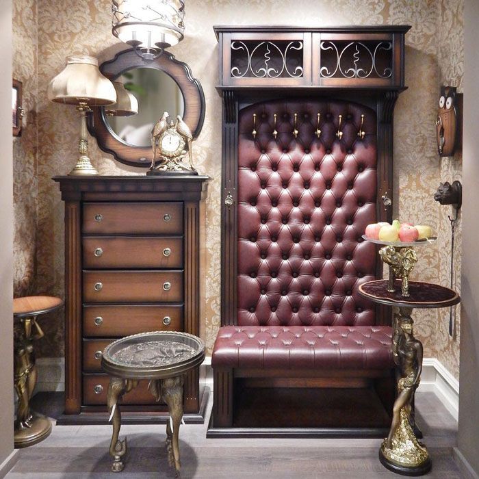 Of the classic English-style pieces of furniture, the armchair with "ears" and the Chesterfield sofa deserve special attention. English mantel chairs are made with curved legs. Their back is so high that a person sitting in a chair can throw his head on it.