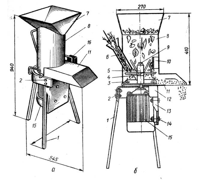 - 6, 7 - inlet necks. The branches are loaded from the side, leaves and other small plant waste are loaded from above.