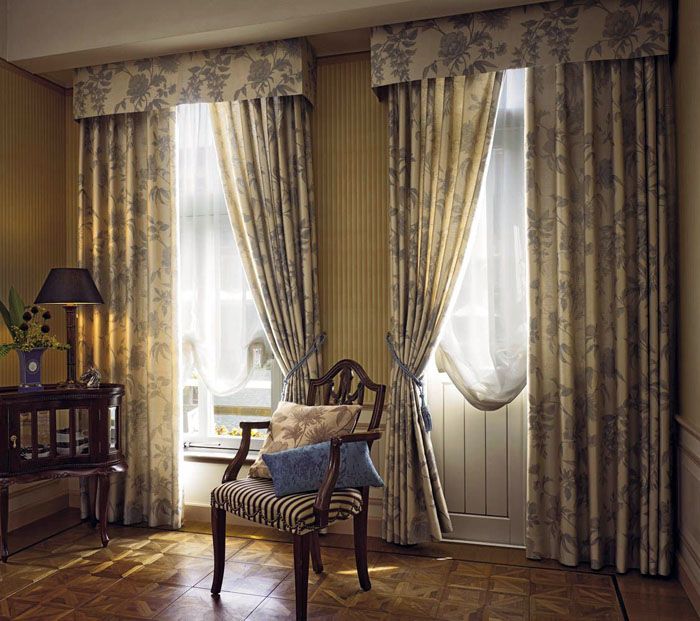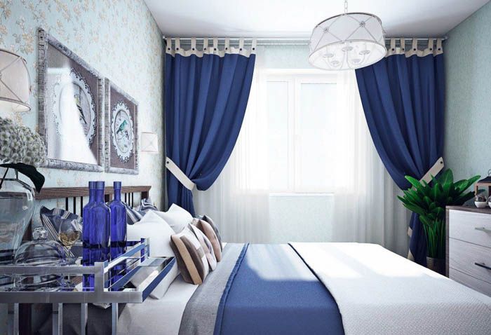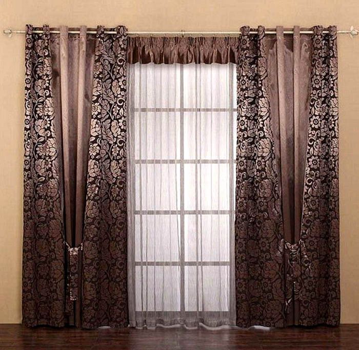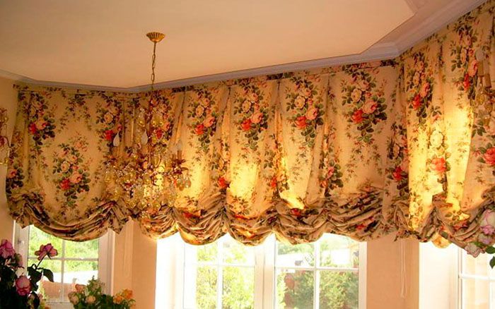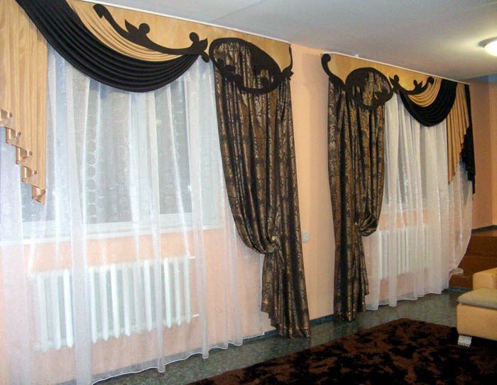 If the design is multi-layered, that is, it consists of a curtain, light tulle or veil. All this is decorated with lambrequins and beautiful garters. The contrast of tissue density plays a role.
