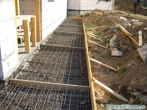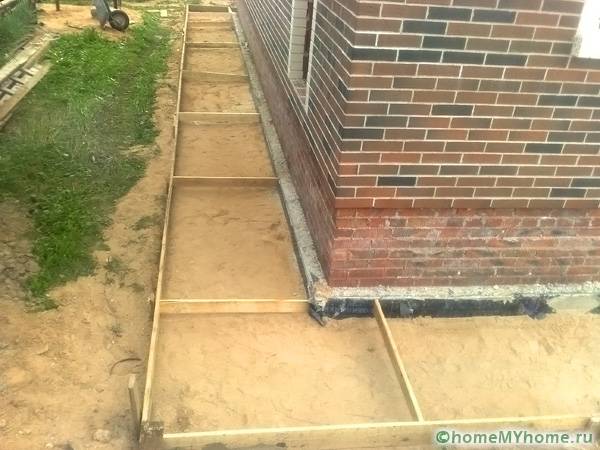 To simplify the laying of the blind area, you can mount the tape in separate blocks. For this, slats are used, which are installed across the formwork.