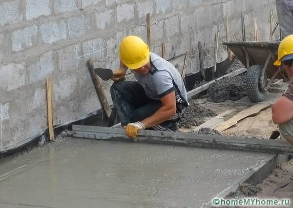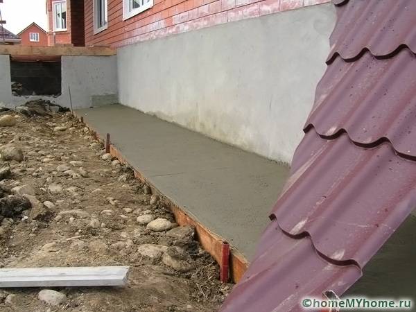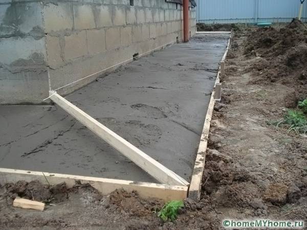 Before filling the blind area, preparatory work is performed. It is necessary to make a foundation. In this case, a concrete screed is performed: