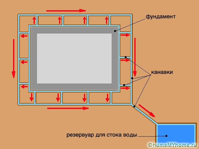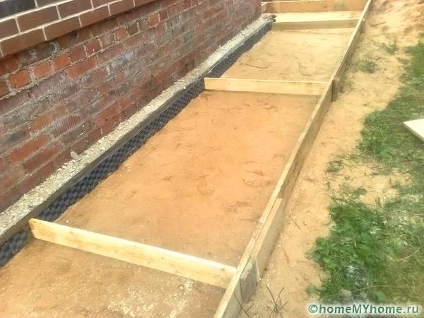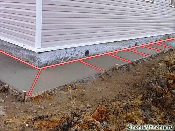 Most often, the trench made is concreted using formwork. Along the entire contour of the concrete tape, special equipped recesses (grooves) are mounted for water outlet.