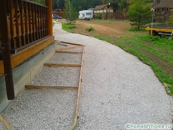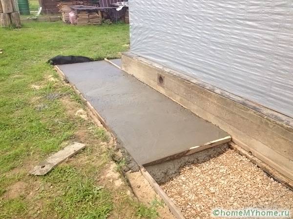 When deciding how to make a blind area around the house with your own hands, it is worth using concrete. The composition is prepared from one part of cement, part of sand and three parts of crushed stone. The mixture is poured in portions.