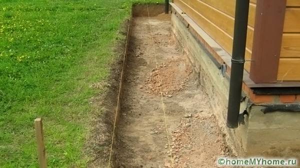 When determining how to make a blind area around the house with your own hands, you need to properly excavate the soil. It is imperative that all walls of the excavation be treated with a special compound that will help destroy weeds. If this is not done, then the weed will destroy the structure made.