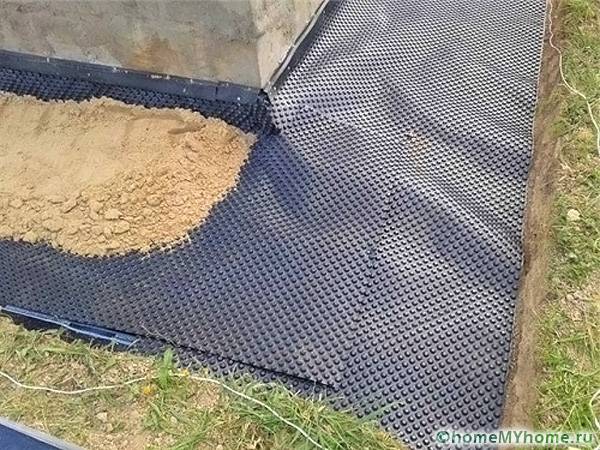 - additionally created waterproofing layer with an overlap on the wall of the building. The material is laid on the concrete surface. This is especially necessary when the water table is high. A reinforcing metal mesh is installed on the surface of the blind area;