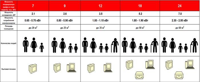 By calculation, all indicators are summarized in the capacity table. Thanks to this data, you can select the optimal product for a specific purpose of the room. For example, for small areas it is rational to purchase mobile, window or wall equipment. In a room with a larger area, a large number of doors and windows, especially those facing the sunny side, it will be more profitable to install a more powerful air conditioner, for example, mono or multi split systems.