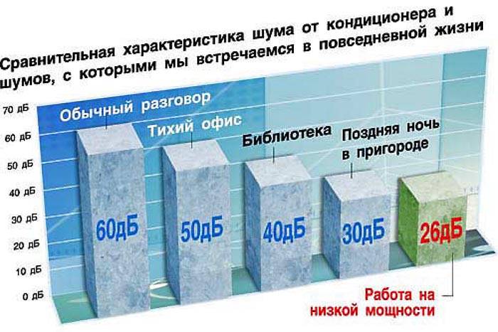 Russian manufacturers offer models with a noise threshold of up to 21 decibels, air conditioners from Japan, this figure has been reduced to 19 decibels. This is accomplished by installing a muffler on internal assemblies. Models with a night level of up to 26 decibels are offered to the general consumer in an affordable price category, while during the day this figure does not exceed 30 decibels.