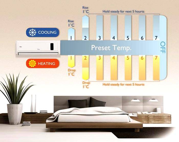 - night mode in the system, it reduces the fan speed to the minimum level. The temperature mark changes very slowly. This function is installed only in modern domestic air conditioners split systems for an apartment. The price for such products is slightly higher, however, a comfortable stay is much more expensive.