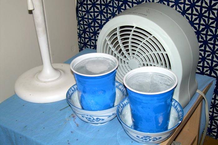 - an alternative to an air conditioner in an apartment can be a fan. At a distance of 30 centimeters from it, you can put a large container of water;