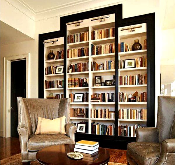 Built-in bookcases with glass sliding doors: convenience and practicality