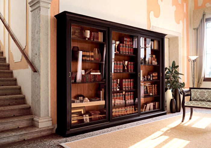 Cabinet bookcases with glass hinged doors: an elegant standard solution