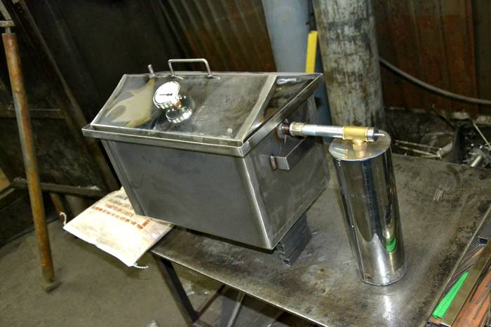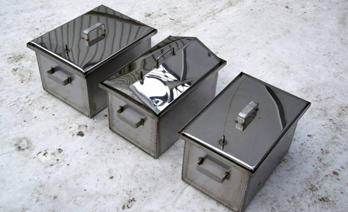A similar cold-smoked smokehouse with your own hands is often made from stainless steel. The insides of such equipment resemble a box with grates that are installed on welded corners. This is a portable version that looks like a suitcase. For the marching structure, sawdust and small firewood are used.