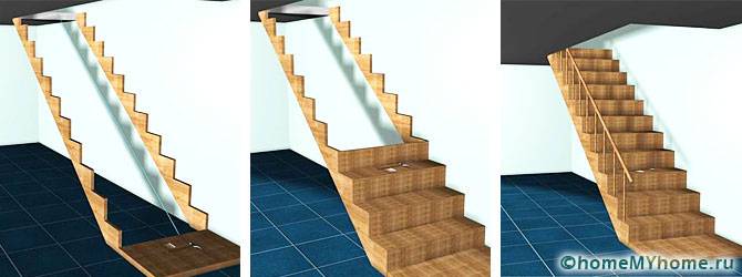 - The installation of the stairs is carried out in the following order: stringers, risers, steps, balusters, railings and handrails.