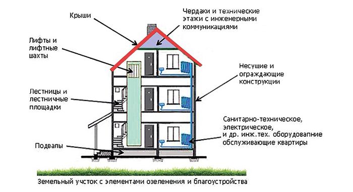 - Premises that are not part of apartments and serve for the maintenance of several real estate objects (staircases and landings, elevators, corridors and technical floors, basements, etc.).