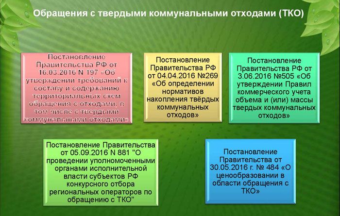 The MSW management rules are regulated by the Government Decree No. 1156 of November 12, 2016 "On the management of municipal solid waste and amending the Resolution of the Government of the Russian Federation of August 25, 2008 N 641". In addition to this document, the rules for handling MSW are governed by the documents shown in the following figure.