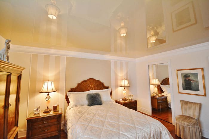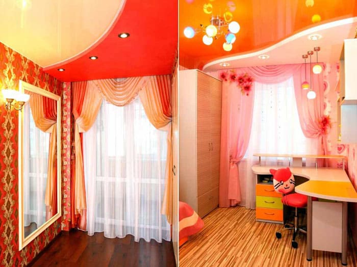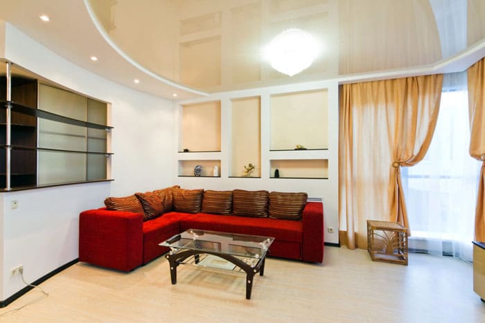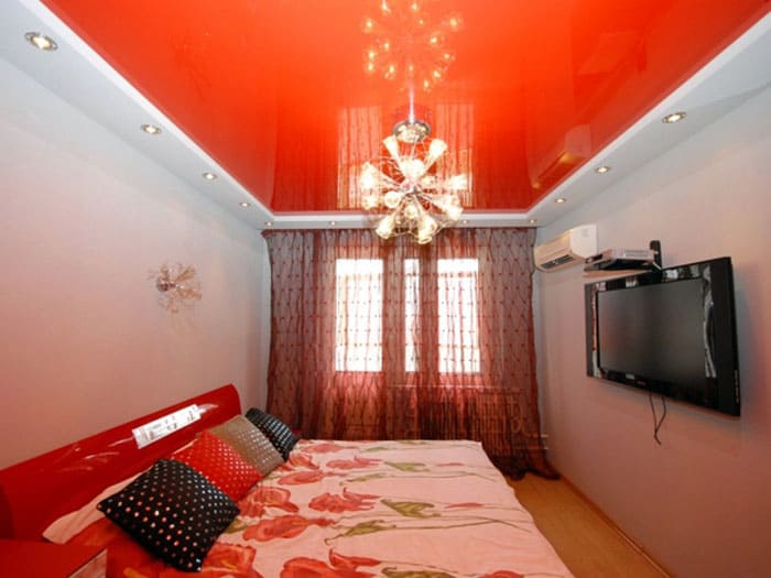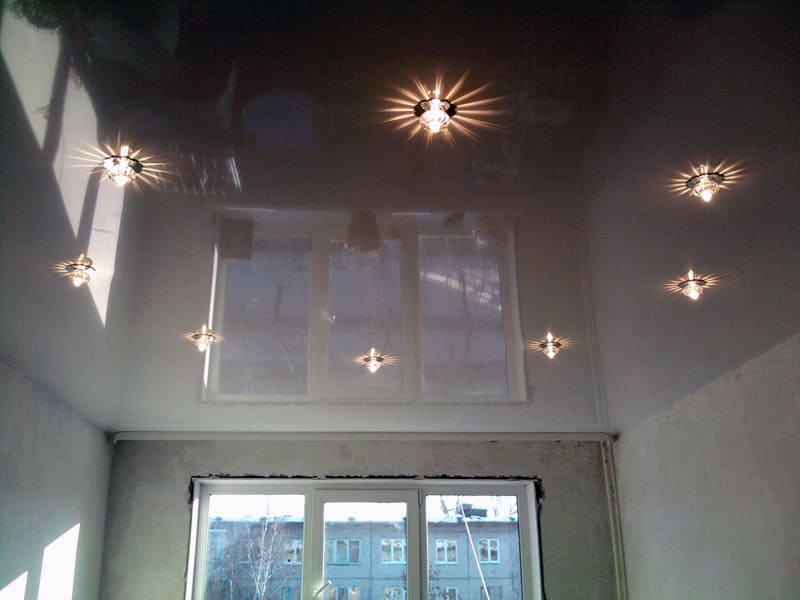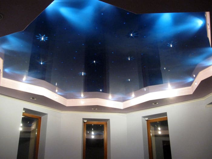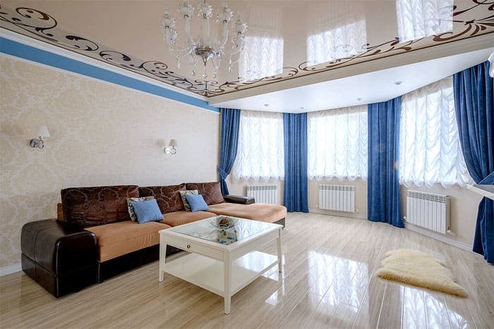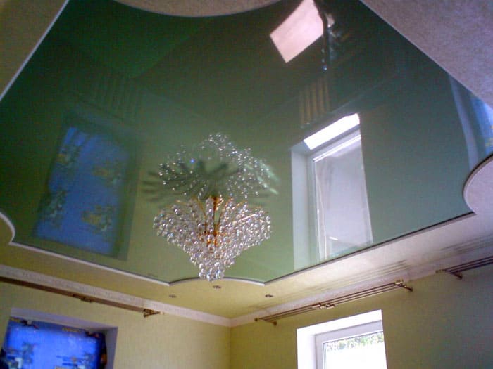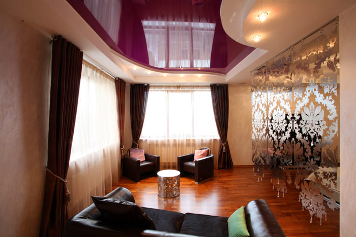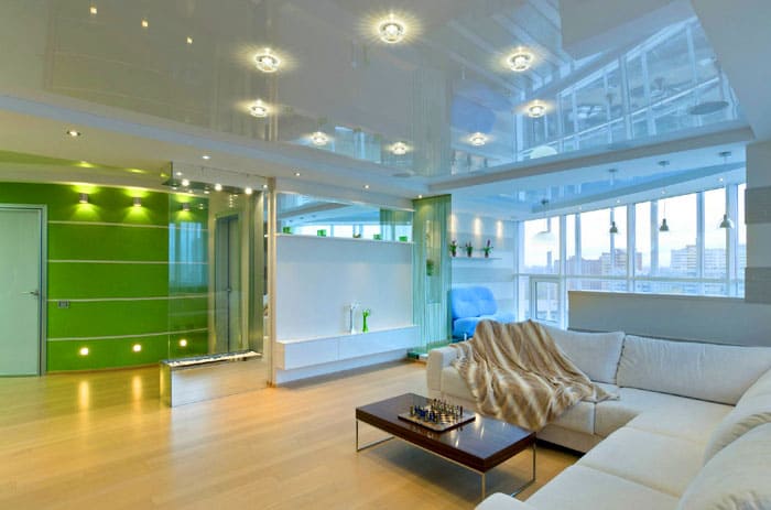 The reflectivity of the gloss allows you to install it in any room, be it a tiny bedroom or a wide living room. This ability is just appropriate to actively use where there is little natural light: on the north side of the house, or in rooms where trees do not let light into. But there is one catch: remember that any light is reflected from the coating, so it's easy to imagine how the headlights of every car passing by will be reflected from the night freeway. But there is a way out: the curtains on the windows were invented for a reason. You can curtain the window at night and not admire the sparkling ceiling.